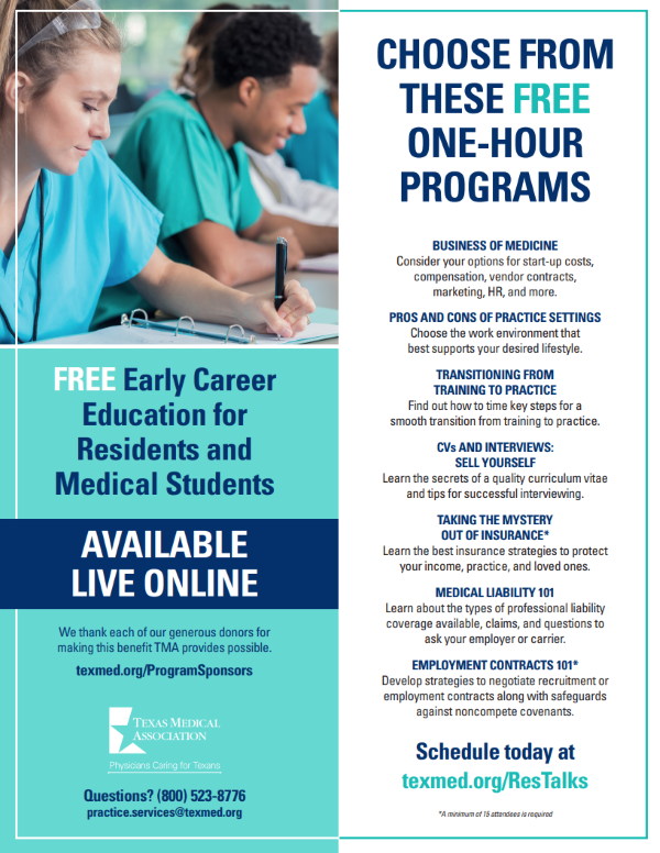 Contact Practice Services at 800-523-8776 or e-mail practice.services[at]texmed[dot]org to schedule a date.